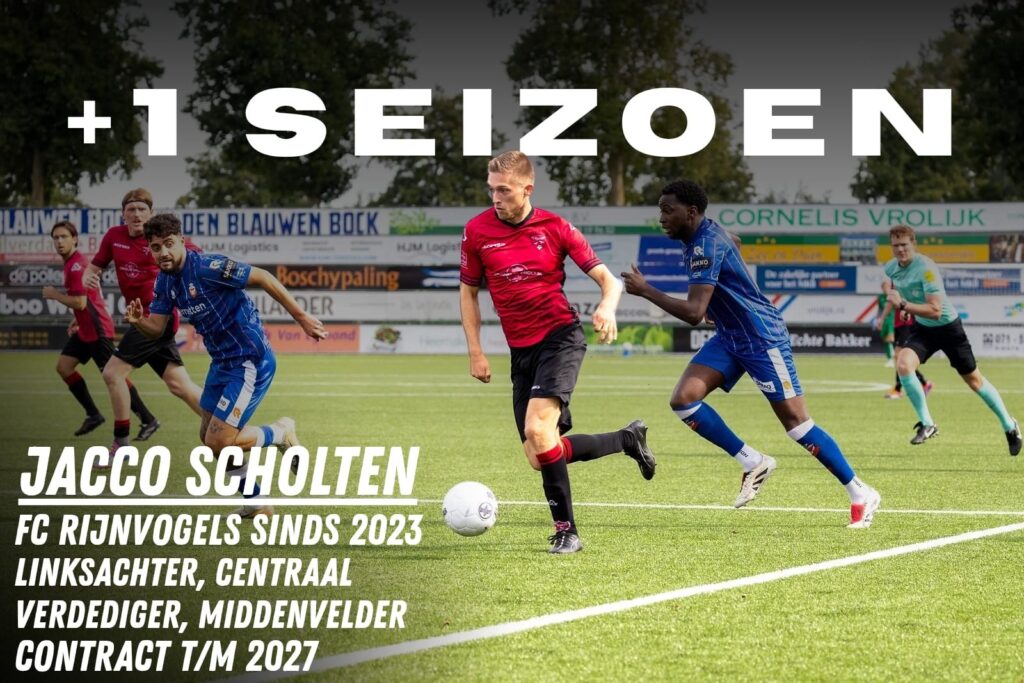 Als laatste heeft ook Jacco Scholten zijn contract verlengd en is daarmee van deze drie de “langstzittende” speler. Deze hardwerkende, snelle multifunctionele inzetbare speler maakt elke wedstrijd vele meters en kan op meerdere posities uit de voeten! Jacco heeft het naar eigen zeggen erg naar zijn zin, en dat blijkt ook wel aan het feit dat hij nog een seizoen in het mooie rood/zwarte tenue te zien zal zijn!