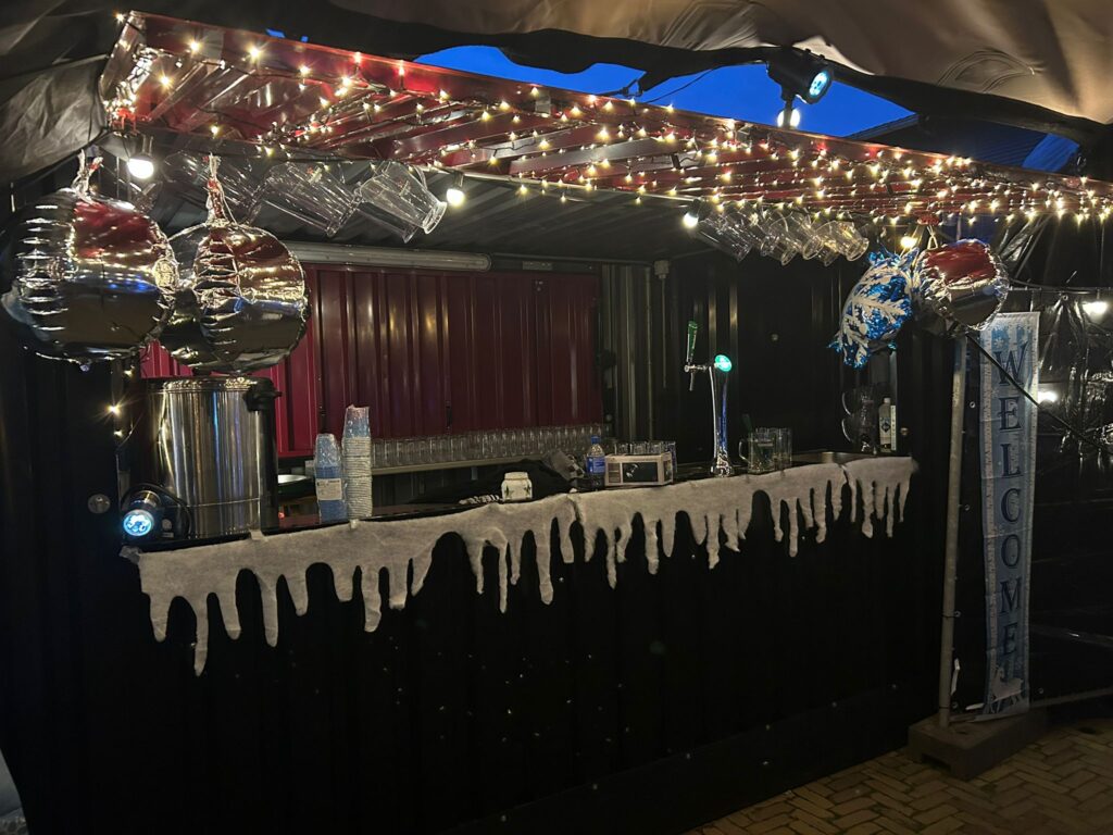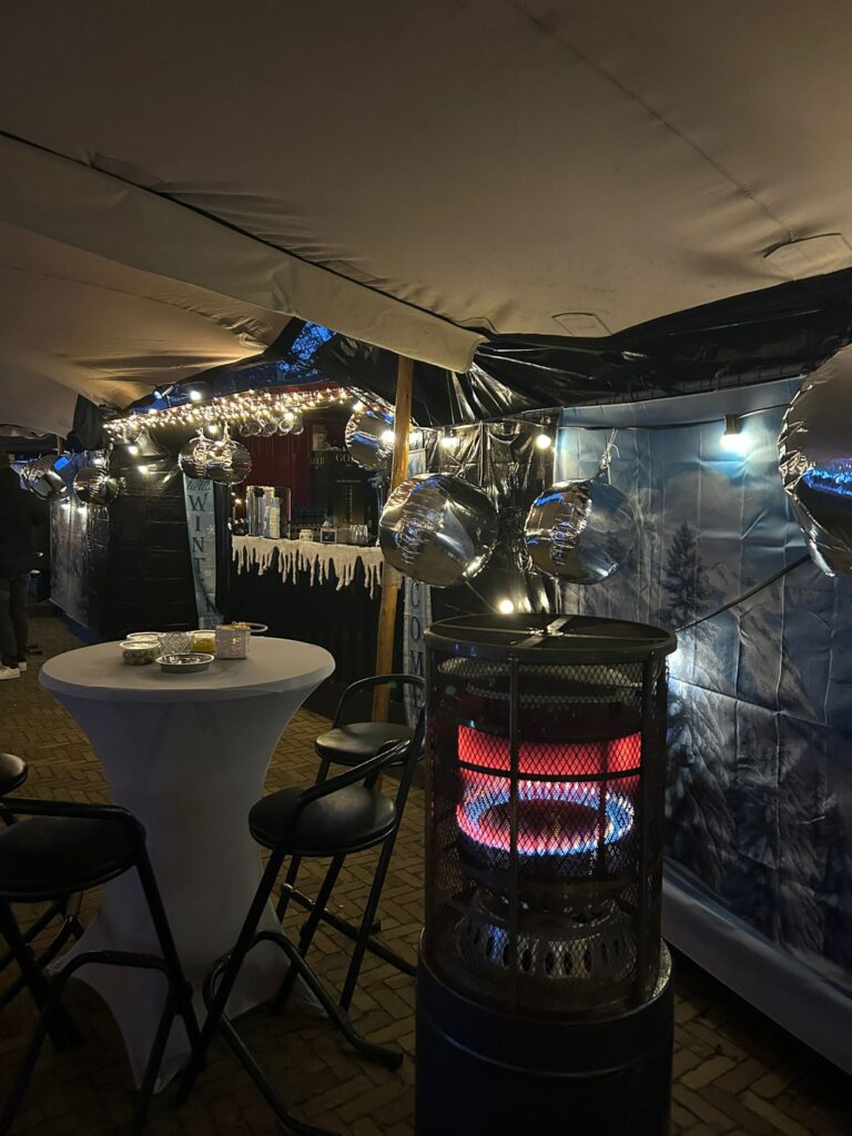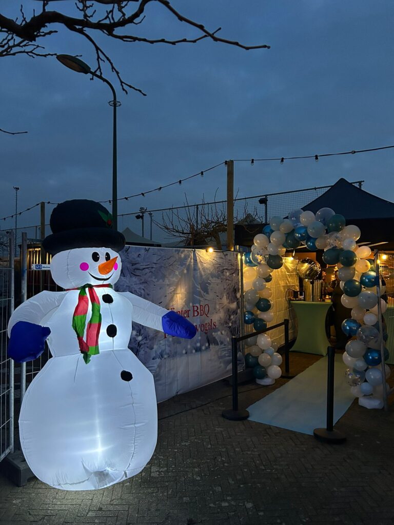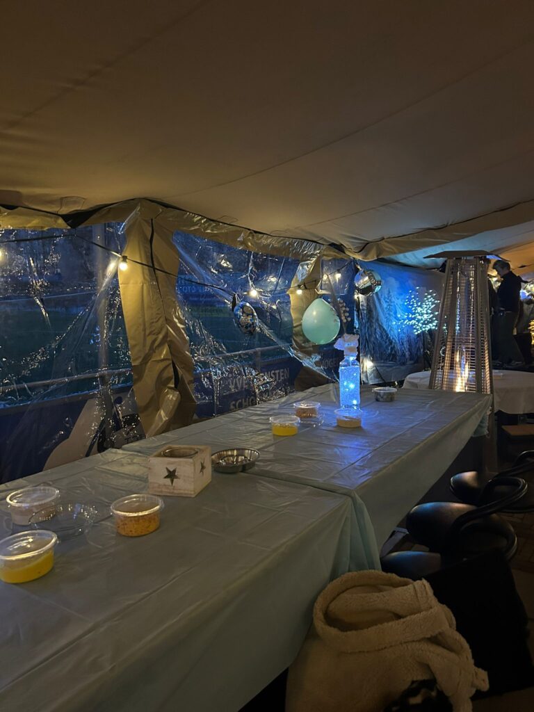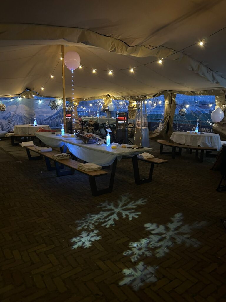 Zaterdagochtend vroeg om 7:00 uur stonden een aantal vrijwilligers en werknemers van ‘de tent’ klaar om de tent op te bouwen en te versieren. Hard doorwerken en af en toe een bakkie tijdens een verdiende pauze. Om 18:00 uur gingen de deuren open en kwam iedereen warm gekleed binnen! Met het vlees en salades van H.H. Catering en ‘T Leste Rondje op de achtergrond was het een topfeest.