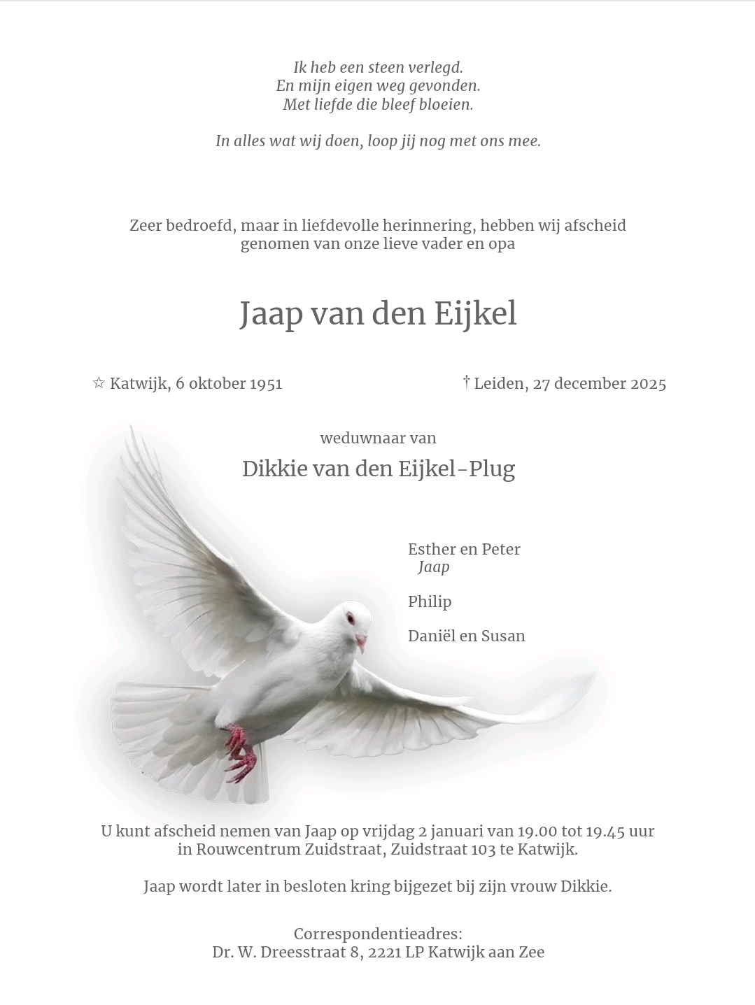Er is gelegenheid tot condoleren op vrijdag 2 januari van 19.00 tot 19.45 uur in Rouwcentrum Zuidstraat, Zuidstraat 103 in Katwijk. Iedereen is van harte welkom om afscheid te nemen.