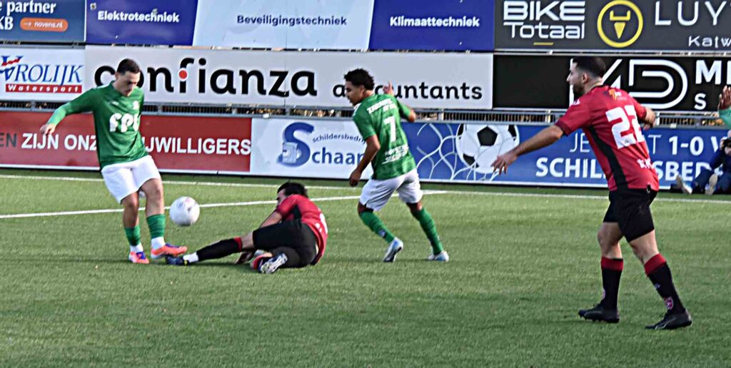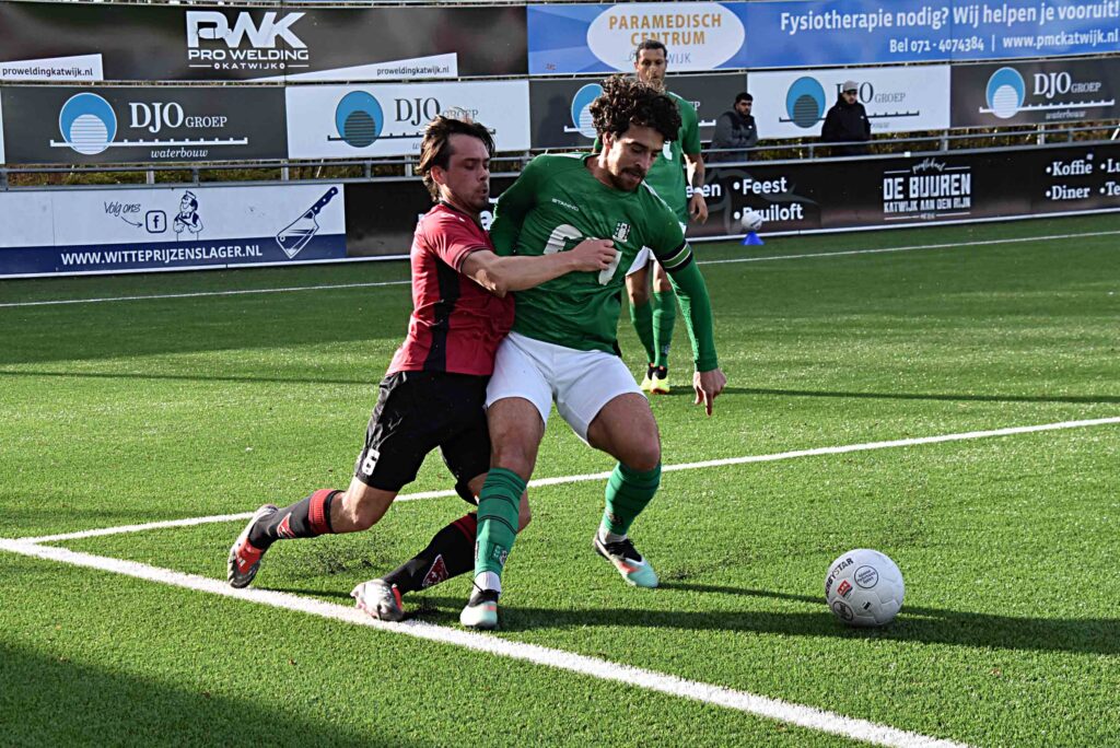 Een wedstrijd met twee gezichten. En tevens een pittig potje. De Vogels toonden nu hun ware gezicht. Daar waar het in het eerste bedrijf ontbrak aan kansen, deze kwamen er nu legio. De eerste was voor Boris van der Wiel maar zijn inzet werd door de Scheveningse uitblinker doelman Ruben Valk (ex. VVSB) met een reflex ongedaan gemaakt. Maar de Katwijkse beer was los. Yassin Kaabouni zag een vrije doortocht op de voet van Valk eindigen. Een rush van Jacco Scholten eindigde wederom op de uitgestoken pantoffel van doelman Ruben valk. Een Katwijkse voorsprong leek een kwestie van tijd van de want de bezoekers blaften soms wel maar beten niet echt. Ook al moest doelman Van de Riet een keer noodzakelijk ingrijpen. Trainer Danny Hijzelendoorn greep in en bracht Maxim van der Meer binnen de lijnen. Een gouden greep want hij was het die nu na een soepele aanval even een medespeler over het hoofd zag maar zelf de trekker doeltreffend over haalde, Het bleek uiteindelijk de belangrijke en winnende treffer te zijn. De roodhemden konden de voorsprong niet uitbouwen maar voorkwamen ook dat de bezoekers er met een gevaarlijke uitval alsnog een puntje aan dit treffen zouden overhouden. Na twee gelijke spelen weer een driepunter waar de Vogels na het verliezen van Kloetinge (2-0 bij FC Lisse) de koploper op twee punten genaderd zijn.