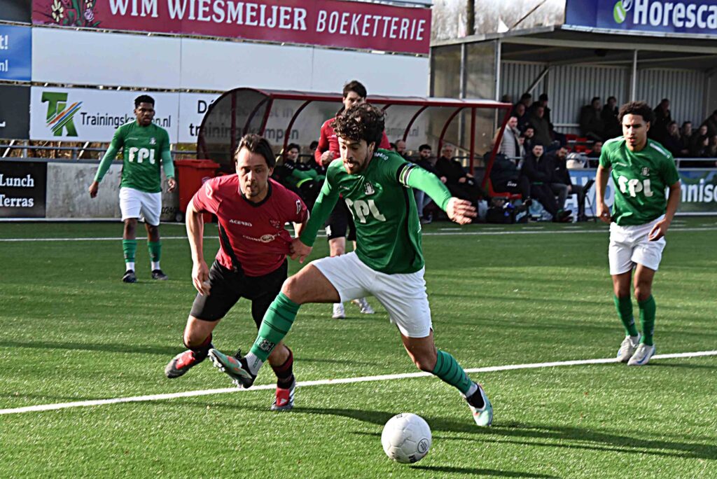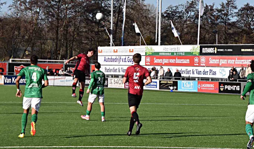 Het werd een wedstrijd met twee gezichten. Kon de thuisclub geen potten breken tegen laagvlieger Scheveningen dat zich in het eerste bedrijf niet onder deed voor de Vogels. De vonken vlogen er aan beide kanten bepaald niet af en er deden zich weinig bloedsollende momenten voor de beide doelen af. Namens de thuisclub kopte Kasper Michel na een corner over en Max Hudepohl raakte uit een moeilijke hoek de buitenkant van de kruising. Doelman David van de Riet moest zich nog eenmaal laten gelden maar toonde zich een betrouwbare sluitpost. Na een matig optreden brak de break met de bekende brilstand aan.