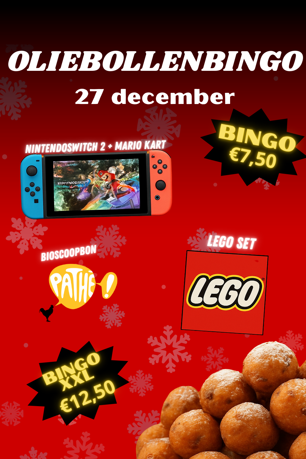 Alle kerstdagen gehad en heb je even zin in wat anders, kom dan op 27 december naar de oliebollenbingo. Uiteraard is iedereen welkom in de kantine, waar de kids worden voorzien van limonade en waar iedereen van heerlijke oliebollen van bakkerij den Dulk kan genieten. Er is een ruim prijzenpakket; bioscoopbonnen, bestuurbare auto’s en als klap op de vuurpijl een gloednieuwe Nintendo Switch + Mario kart. Voor €7,50 per kaart ben je verzekerd van een normale bingo kaart en voor €12,50 ben je verzekerd van een bingo kaart XXL.