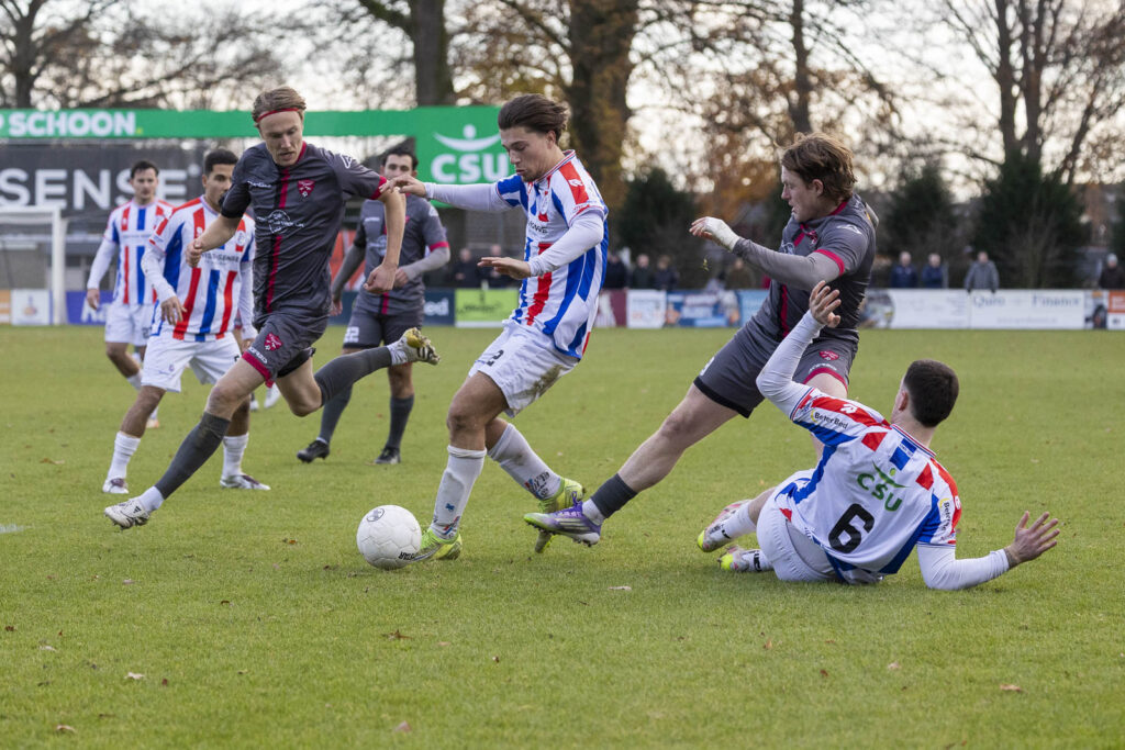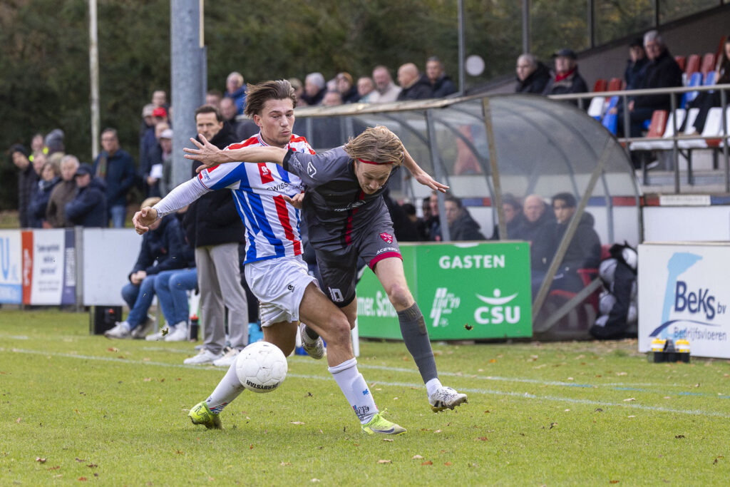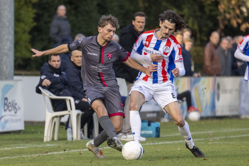 Rijnvogels liet echter vanaf de het eerste fluitsignaal van de soeverein fluitende scheidsrechter Lars van Leeuwen geen twijfel opkomen wie hoger op de ranglijst staat. Al in de eerste minuut gaf rechtsbuiten Anthony Slierendrecht met een scherpe voorzet die maar rakelings langs het doel ging een visitekaartje namens de Katwijkers af. Rustig opbouwend en verzorgd combinerend doken steeds weer spelers in kansrijke positie voor de boomlange keeper TJ Odunze op. In de 10e minuut testte Kees Zwanenburg Odunze met een strak schot en even later had de uitblinker aan de kant van de thuisploeg een antwoord op de intikker van Boris van der Wiel na een scherpe voorzet van Kevin Gomez-Nieto. De kopbal van aanvoerder Kasper Michel na de aansluitende corner belandde eveneens in de armen van Odunze. Maar de 1:0 kon uiteindelijk niet uitblijven: Kees Zwanenburg bediende Zion Valies en de sierlijke middenvelder van Rijnvogels omspeelde eerst nog zijn tegenstander om daarna met een hard en laag schot in de linkerhoek Odunze voor de eerste keer vanmiddag kansloos te laten.