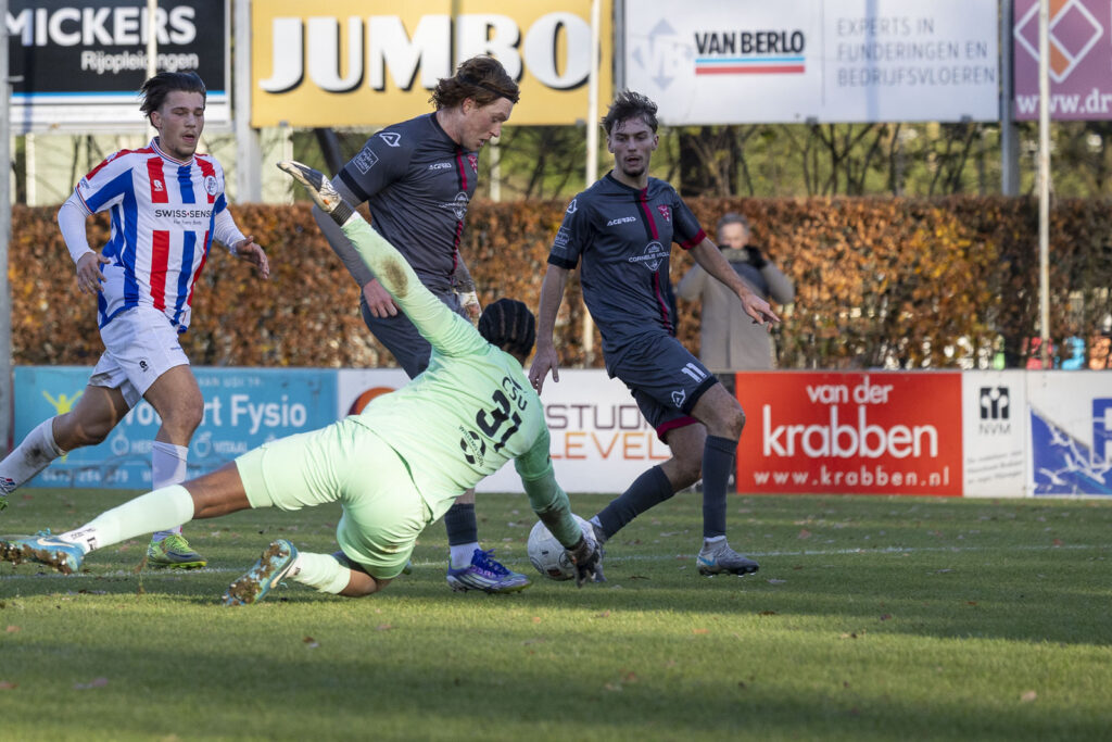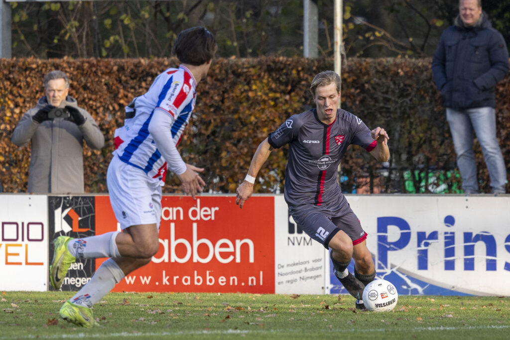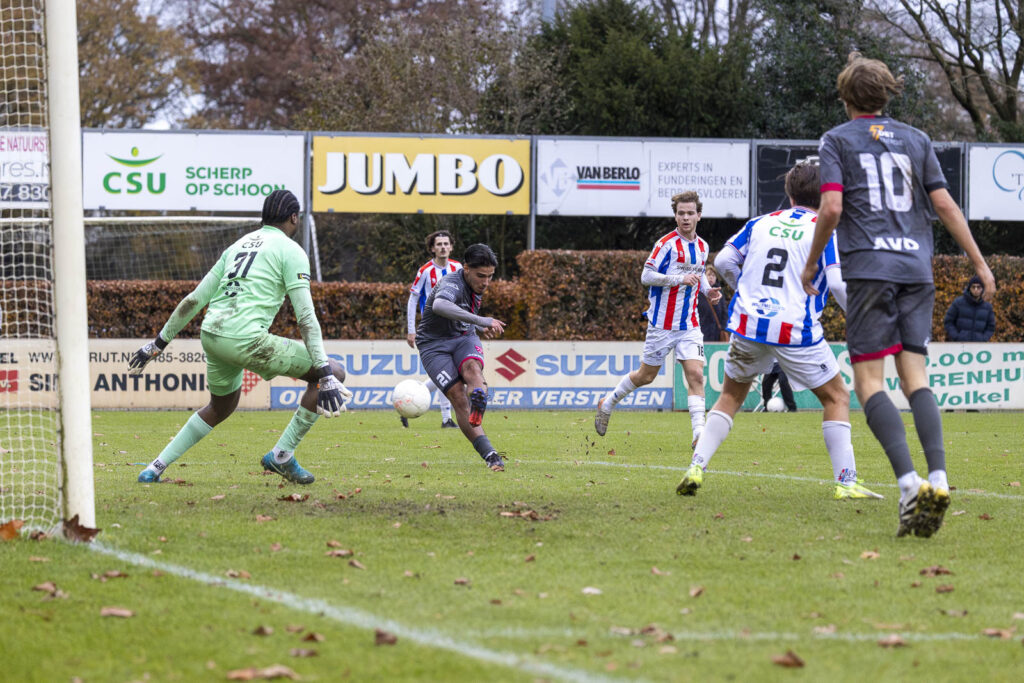 Tot dat moment was UDI’19 nog niet een keer gevaarlijk voor het doel van David van de Riet gekomen. Alle aanvalspogingen van de Tricolores werden geconcentreerd en fel verdedigd en indien noodzakelijk met een lichte overtreding op het middenveld onschadelijk gemaakt. Sterker nog, in de eerste helft vloog geen enkele bal tussen de palen van de Rijnvogels goalie. Van de Riet kreeg zelfs bijna een assist voor de 2:0 op zijn naam toen hij ver uit zijn doel een lange voorzet onderschepte. Zijn schot belandde pardoes bij spits Maxim van der Meer die slim wegdraaide van zijn tegenstander en ineens alleen op de keeper af kon gaan. Nadat van der Meer Odunze had omspeeld schoof hij de bal richting het lege doel. Waar de goalgetter en alles wat Rijnvogels is de tweede treffer al wilden vieren, voorkwam een ultieme sliding van een UDI’19 verdediger dat de bal de doellijn passeerde. Vlak voor de pauze kreeg van der Meer nog een goede kans, maar nu was het weer Odunze die de bal weg kon wegboksen.