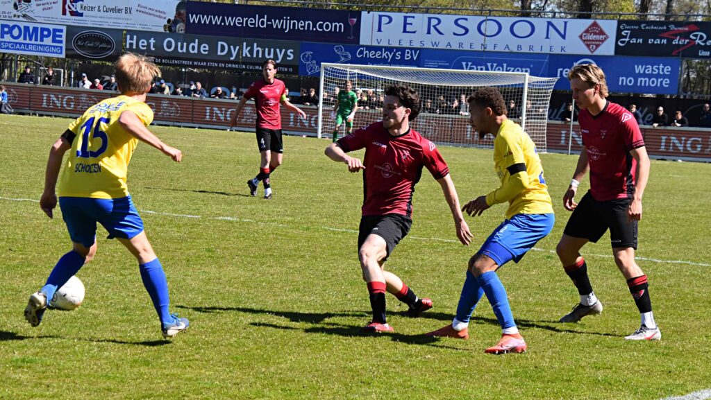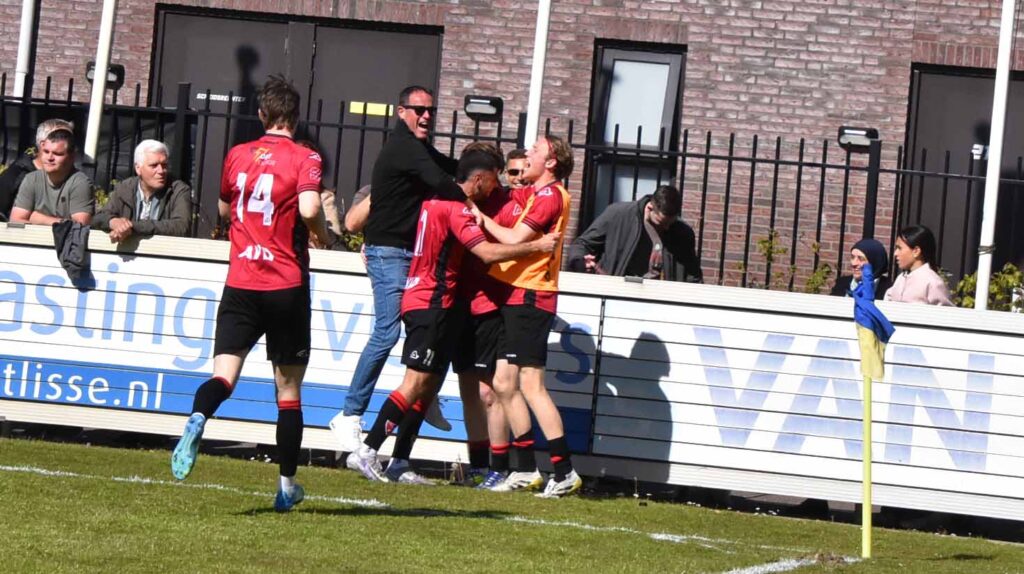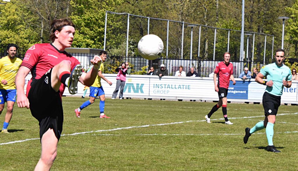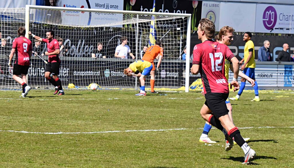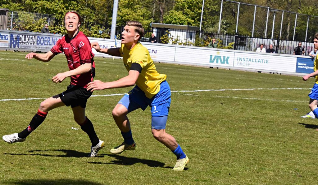 Was de rode kaart voor De Bruijn terecht, aan de tweede rode kaart van deze wedstrijd kleeft een vraagteken. Weliswaar was het een domme overtreding van Jesse Assendelft net over de middenlijn maar hier was geen sprake van een doorgebroken speler want er stonden nog een aantal Katwijkse roodhemden achter hem. Maar goed, de arbiter beslist ook al werd aan deze sanctie door velen getwijfeld. Hierdoor werd de balans in het aantal acteurs weer in evenwicht gebracht. Kort voor dit incident hadden de Vogels al ruimer afstand moeten nemen maar een lob van Kaabouni eindigde bovenop de deklat en zijn pass op Maxim van der Meer werd door de ex-FC Lisser over gejast. De Vogels vergaten het duel op slot te gooien en het werd weer een echte wedstrijd zeker nadat de opdringende thuisclub via Enzo Stroo de anschlustreffer binnen kopte, 1-2. Zoals eerder dit seizoen konden de Vogels in de slotfase geen voorsprong adequaat verdedigen en het werden lange halen naar voren om te overleven. De fijne touch van de eerste helft ontbrak maar het ging nu om het resultaat. Omdat de gastheren geen gelijkmaker in huis hadden en de uitvallen van de Vogels gevaarlijk waren werd in de slotfase de wedstrijd beslist. Een hoge bal van Kevin Gomez Nieto caramboleerde achter Verswijveren via lat en paal en uit een lastige hoek schoof Maxim van der Meer zijn voormalige werkgever naar een 1-3 achterstand en was de topper beslist. Dat invaller Imad Charai er in de blessuretijd nog 1-4 van maakte strooide extra zout in de geel-blauwe wonde. Kloetinge dat op de titel afstevent is lachende derde en de Vogels loeren nog op de nacompetitie middel een vervangend periode. De tweede plek is weer in Katwijkse handen.
